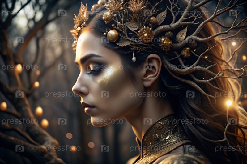 Творческий баннер для салона красоты в черно-золотом цвете. Красивая женщина, окруженная лесом с макияжем и волосами. Золотые ветви дерева в волосах. Индустрия красоты