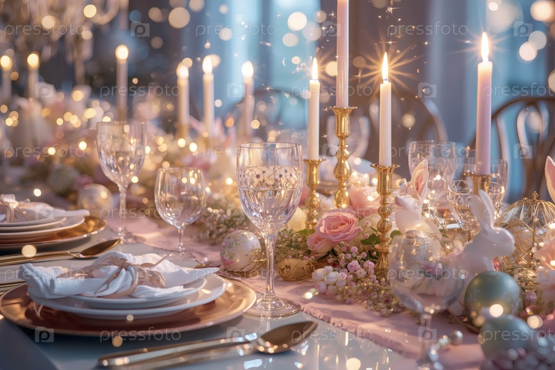 Пасхальный баннер 2026. декоративная тарелка, столовая посуда, стаканы, пасхальные яйца и кролики. концепция празднования Пасхи для кафе и ресторанов