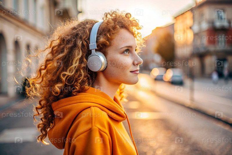 Молодая красивая кудрявая женщина слушает музыку с наушниками на вечерней улице города при закате солнца.Мир, гармония, отдых и расслабление