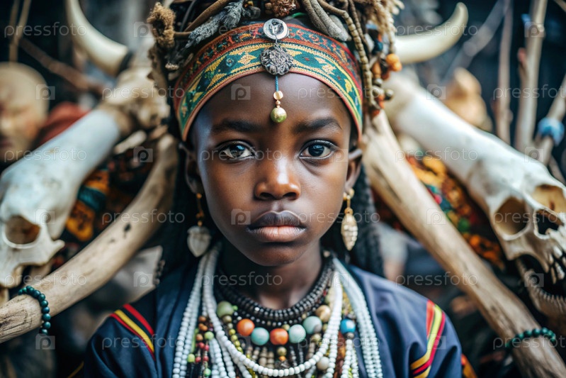 Красивая африканская девушка в традиционном национальном костюме. с костями. портрет символизирует традиции, культуру и красоту африканского народа