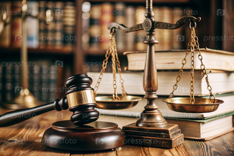 Древесный молоток, книги и весы на столе