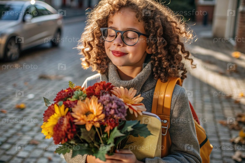 Красивая маленькая кудрявая девочка в очках и букете осенних цветов ходит в школу впервые. Ребенок со школьной сумкой, книгой и цветами. Малыш на городской улице. Возвращение к школе