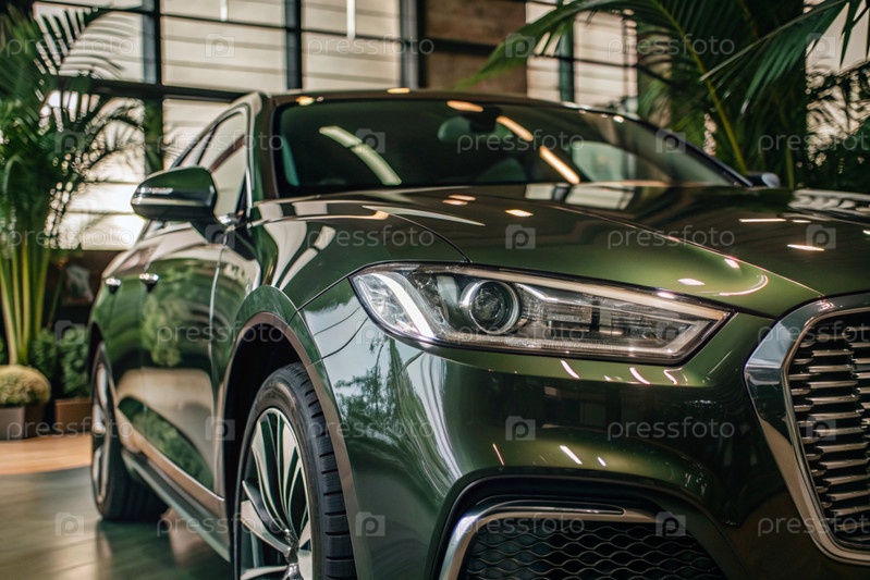 Офис современного автосалона. Бизнес-концепция продаж и аренды автомобилей. Новый автомобиль припаркован в современном автосалоне. Концепция автолизинга и страхования. Электрическое транспортное средство