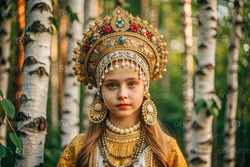 Красивая девушка в традиционном русском национальном костюме.Перед березовым ростом.Портрет символизирует традиции и красоту русского народа