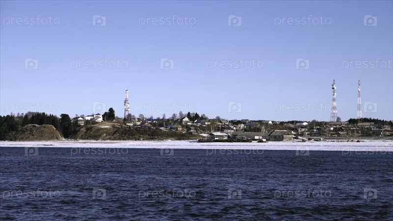 Плавание мимо берега с деревней зимой. Клип. Прекрасный вид на пляж со льдом и деревню в солнечный день. Деревня у реки в солнечный зимний день
