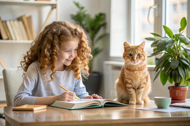 Образование и обучение. маленькая кудрявая девочка делает домашнее задание. ученик выполняет школьное дома. рядом со мной сидит рыжеволосая кошка