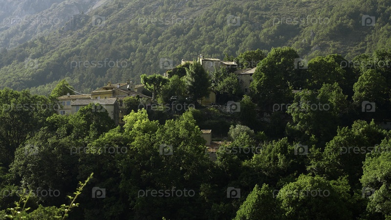 Зелёные горы с домами. Идите дальше. Летний солнечный пейзаж в горах, где растут деревья и стоят дома. Высококачественная запись 4k
