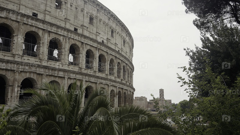 Рим, Италия - 12 августа 2022: Самый большой амфитеатр древности в Риме. Идите дальше. Огромный колозей из белого камня с зелеными растениями, растущими рядом с голубым небом