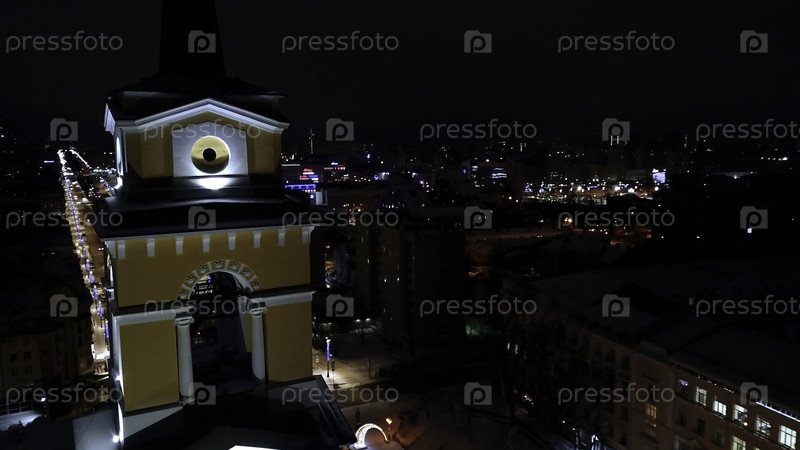 Ночной вид на год из вертолета. Клип. Виден темный город, освещенный уличными фонарями с высокими домами и башнями и дорогой с трафиком