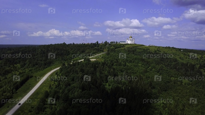 Горы над рекой. Клип. Вид с высоты зеленых лесов и реки внизу и храма, стоящего на расстоянии, а голубое дневное небо видно. Высококачественная запись 4k