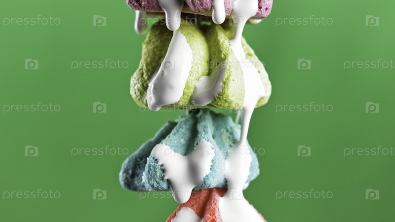 Цветные сладости со сливком на зеленом фоне. Сток-клип. Воздушные печенье в жидкой белой смеси. Видео для рекламы добавления сладких продуктов. Сладости и хромаки