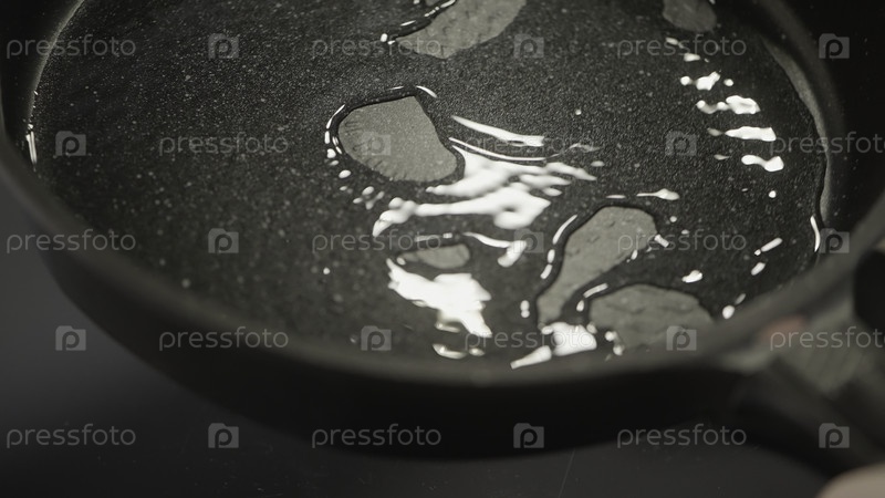 Приготовление жареных блюд. Продолжайте. Нагретая сковородка, смазанная маслом, которая поворачивается в разных направлениях. Высококачественный видеоматериал 4k