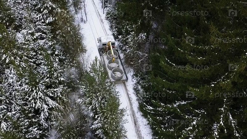 Дневной пейзаж. Клип. Вид с высоты движущегося грузовика на лесомагистрали с грузом в задней части. Персонал FullHD высокого качества