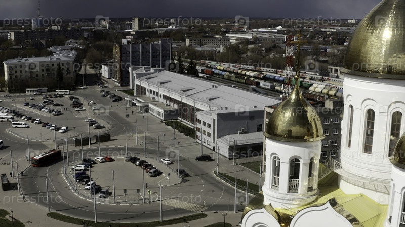 Вид с высоты птичьего полета на красивый центр города с огромными соборами с золотыми куполами, парковочными местами и большими жилыми зданиями