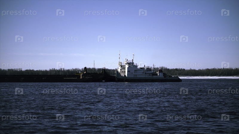 Прекрасный вид на паром, плавающий вдоль реки в солнечный зимний день. Паром плывет по голубой реке зимой