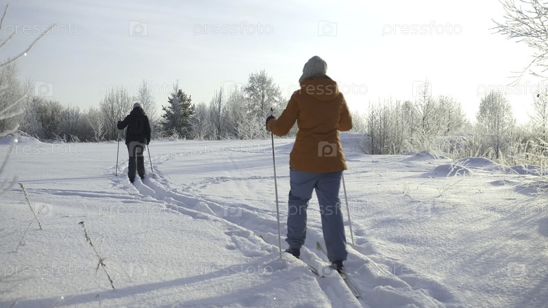 Медленное движение лыжников, едущих по заснеженной тропе в холодный зимний день.Креативное.Люди путешествуют и перемещаются через снег