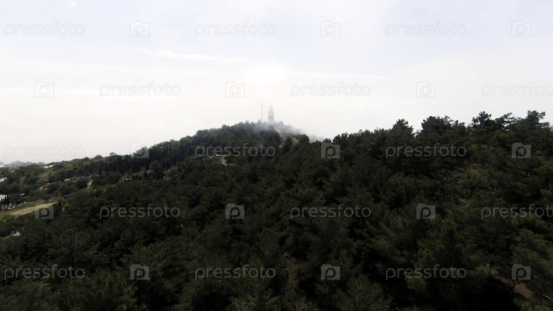 Пролететь над зеленой летней горой на облачном фоне.Стрельба.Аэрофотосъемка зелени и холма