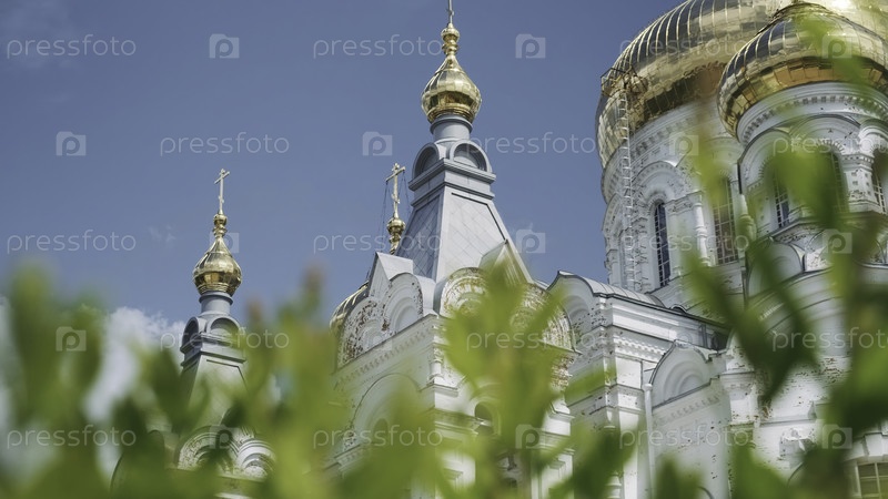 Огромная белая каменная церковь с золотыми куполами. Красивый храм, расположенный рядом с деревьями со зелёными листьями