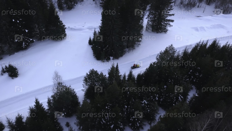 Вид на снегоход, едущий по зимнему лесу. Клип. Снежный мотоцикл со фарами едет вечером в лесу зимой. Снежный мотоцикл ездит по лесу в пасмурный зимний день