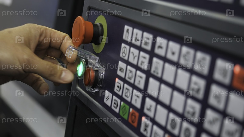 Кнопки большого нажатия панели управления машины. СМИ. Запустить производственную машину с помощью панели управления. Панель с кнопкой для управления производственной машиной