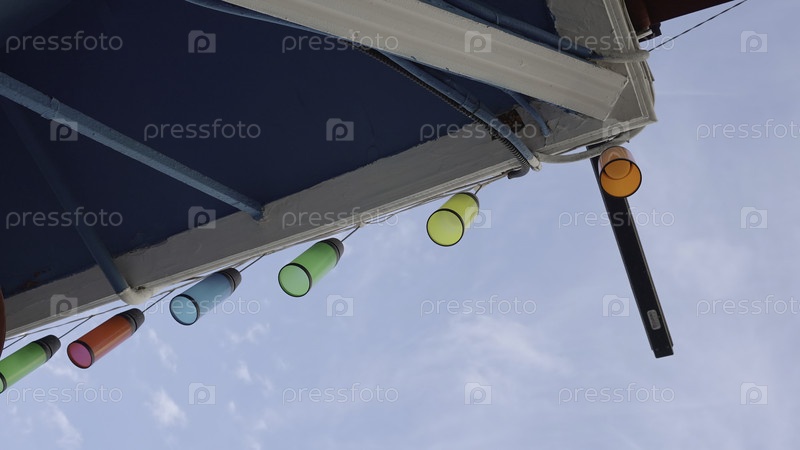 Цветные огни на крыше. Продолжайте. Многоцветные стеклянные лампочки висят с крыши дома. Красивые красочные огни на фоне синего неба