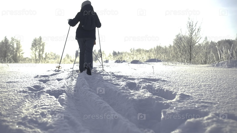 Медленное движение лыжников, едущих по заснеженной тропе в холодный зимний день.Креативное.Люди путешествуют и перемещаются через снег