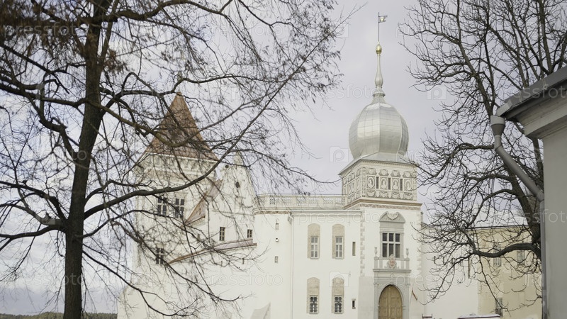 Прекрасный вид на яркий замок. Идите дальше. Осенние деревья возле замка с красивой архитектурой. Архитектурный памятник в историческом центре европейского города
