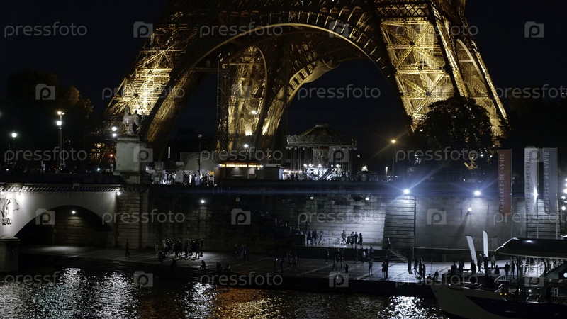 Париж, Франция 10 сентября 2022: Эйфелева башня в Париже Продолжайте. Красивый ночной город с набережной и знаменитой башней. Знаменитое туристическое место у основания Эйфелевой башни