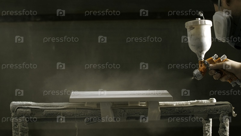 Рисование распылительной доски.Креативность.Расписывающий рисует доску с помощью опрыскивателя.Работник в костюме красит продукт пистолетом на фабрике