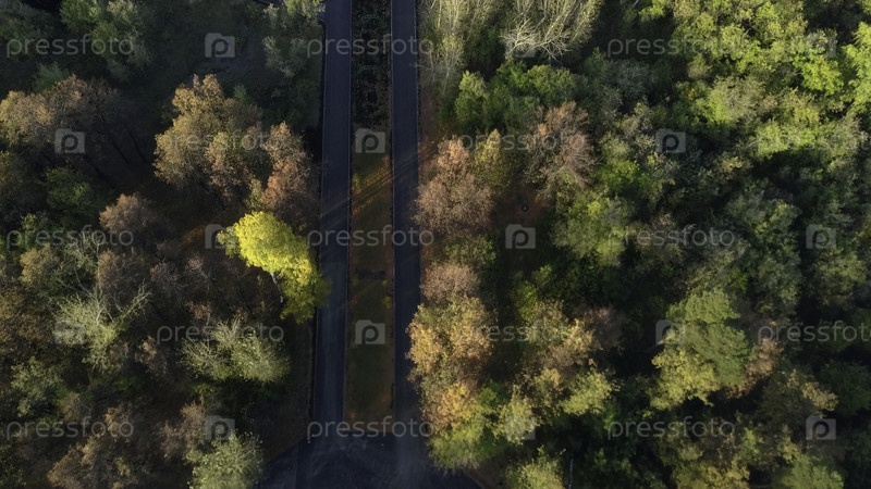 Вид на дороги в осеннем лесу. Клип. Хорошо сохранившиеся асфальтированные дороги в осеннем лесу. Дорожная система в лесу