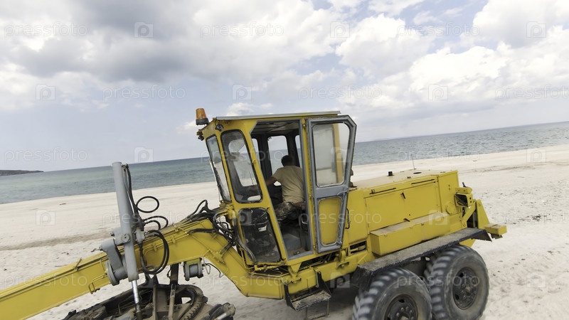 Бульдозерная стройплощадка.Стрельба.Вид бульдозера, едущего на пляже вблизи моря.Горня песка или строительная площадка у моря