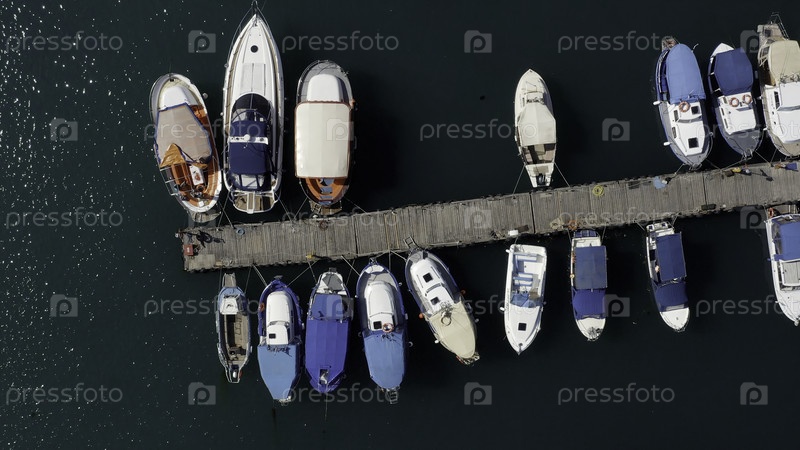 Океан и мост, где припаркованы лодки и суда, которые закреплены веревкой