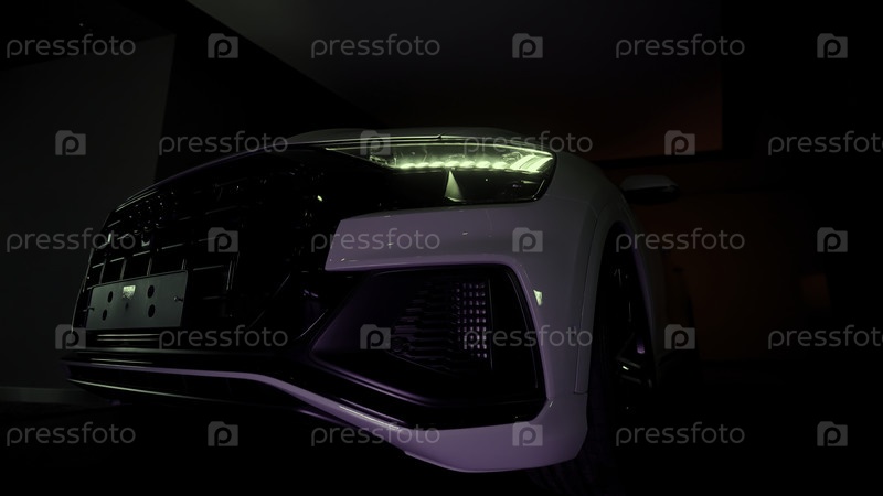 Токио, Япония - 18 июня 2022 года: Новый белый чистый иностранный автомобиль. Давай. Большая машина без номерных знаков, стоящая в салоне и мигающие фары. Высококачественная запись 4k