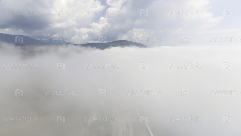 Вид сверху на плотные облака с вершиной горы на горизонте. Снимок. Полет по туманному небу с густыми облаками с вершины горы. Пейзаж верхней части зеленой горы на горизонте среди белых облаков