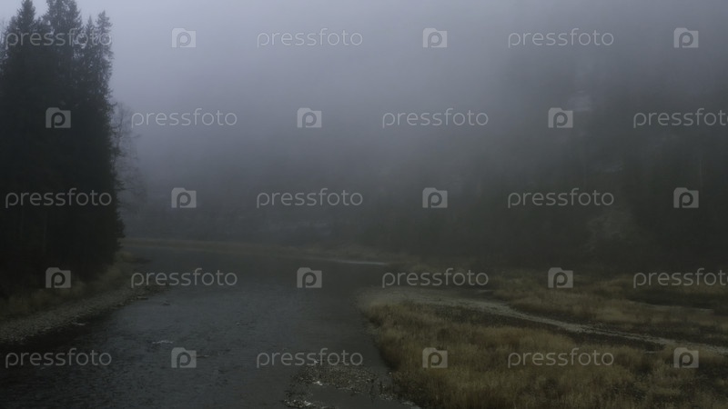 Темный пейзаж.Клип.Глубокий туман над холодным озером и лесом и обнаженные слегка зеленые деревья.Высококачественные кадры 4k