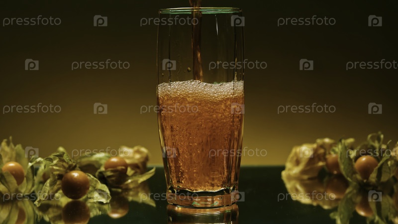 Питье с ингредиентами наливают в прозрачное стекло. Стокклип. Яркий напиток с газами заливают в стакан. Ингредиенты напитка выливают в стакан