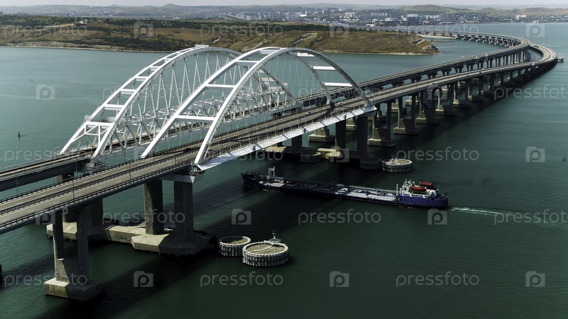 Вид на паром, проходящий под мостом. Стрельба. Большой мост от шоссе через бирюзовое море. Красивый белый мост с проезжей длинной лодкой в солнечный день