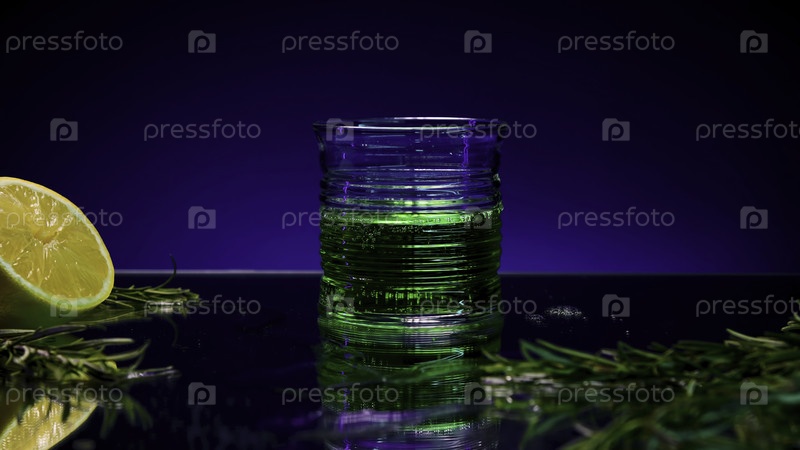 Закрытый стакан зеленого напитка. Застежка для акций. Освежающий алкогольный напиток в стакане на цветном камне. Алкогольный напиток с ингредиентами. Бар и напитки