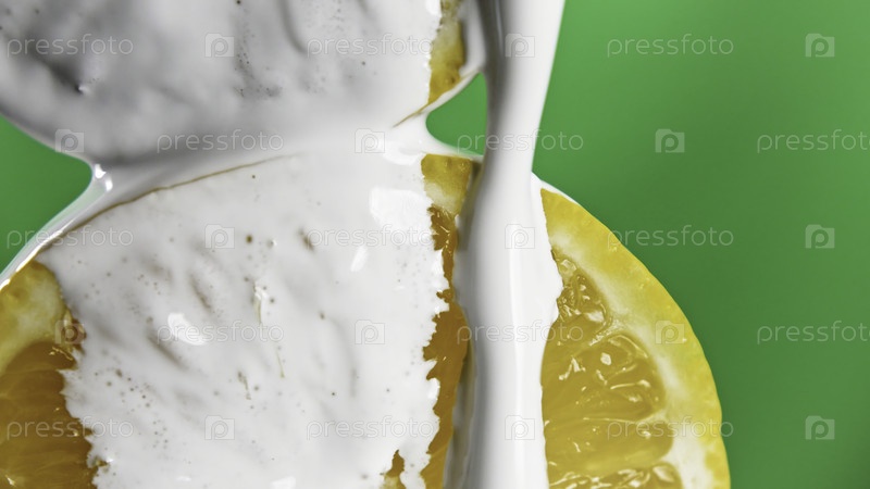 Клубовый снимок цитрусовых фруктов с белой краской. Сток-клип. Видео цитрусовых и протекающей белой жидкости. Творческое видео с фруктами и белым сливком на зеленом фоне