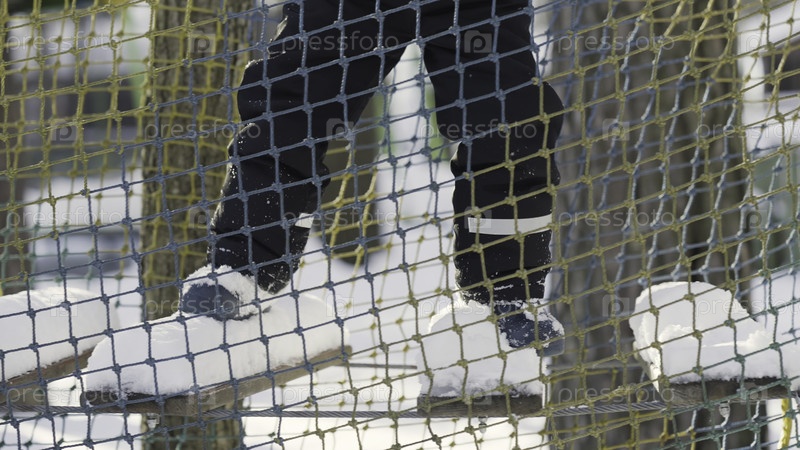 Есть человек, идущий по парку веревок. Идите вперед. Человек ходит по канатной лестнице на трассе с препятствиями. Парк или трасса с препятствиями зимой