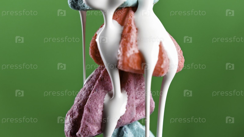 Цветные маленькие бизе. резервная запись. небольшое аккуратное хрустящее печенье на зеленом фоне, которое стоит одно над другим и заливается сахарным сиропом. высококачественный 4k кадры