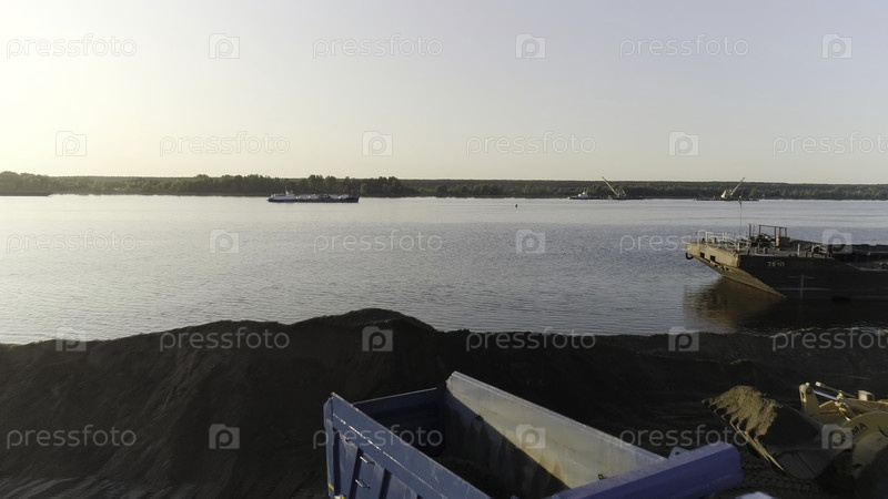 Очистить береговую линию реки с помощью судов. Сцена. Вид сверху на реку с баржей и очистительным берегом. Экскаваторы очищают берег для пирса