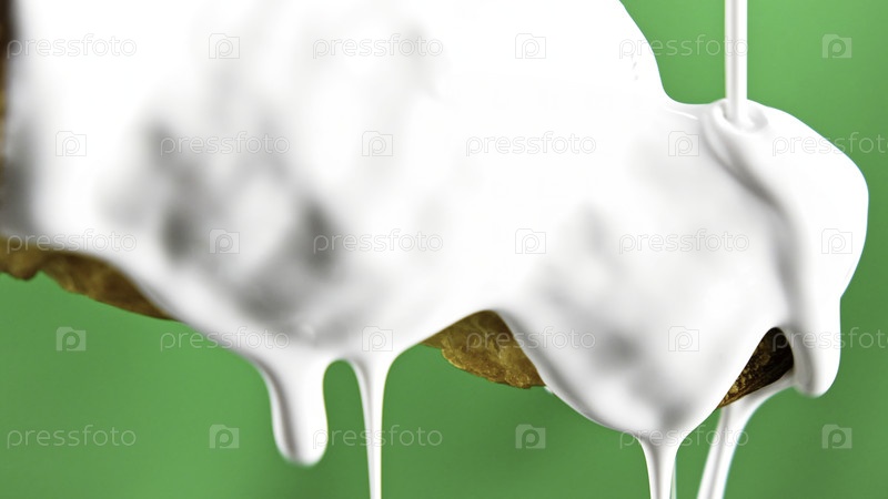 Конфеты в белом креме. Сцепка с продуктами. Капля белой жидкости на выпечке. Выпечка с жидким капельным кремом. Закрытие сливочного булочки на зеленом фоне