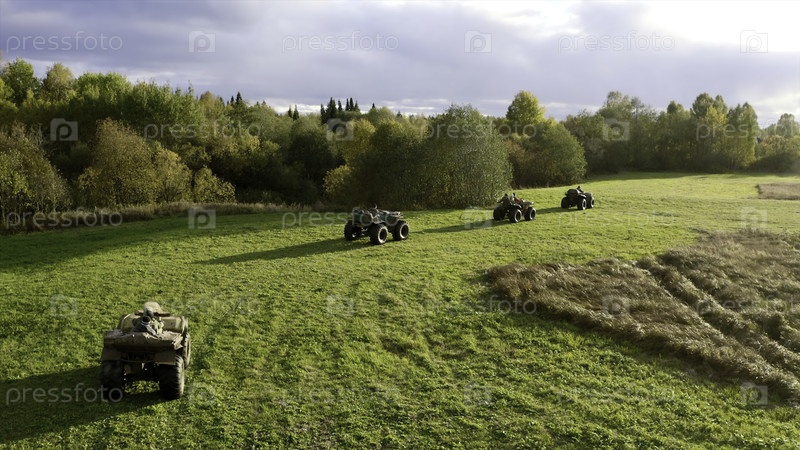 Зелёное летное поле. Вид беспилотника на прогулку с квадроциклами, едущими в ярком дневом поле возле леса. Высококачественный 4k кадры