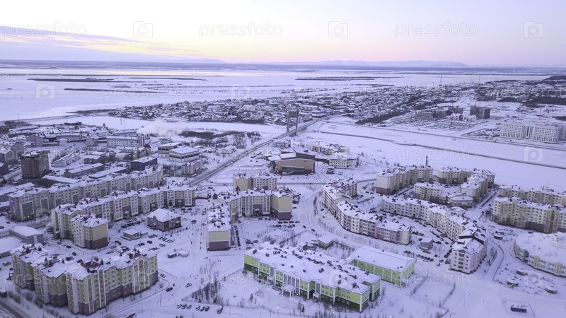 Вид на город против горизонта зимой. Клип. Прекрасный вид города у озера с зимним пейзажем на горизонте. Заснеженный город с озёрами в пасмурный зимний день
