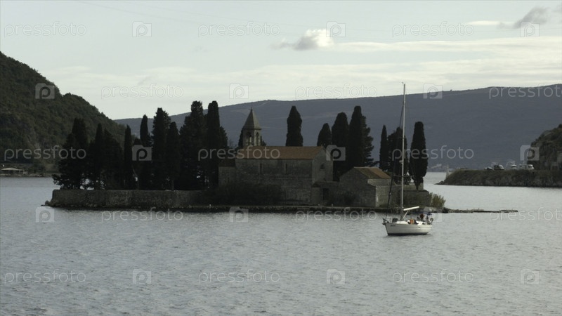 Черногория, Перест - 29 июля 2021: Вид на остров со средневековой крепостью. Креативность. Красивый пейзаж острова посреди залива со средневековой архитектурой. Остров Святого Георгия является историческим памятником средневековой архитектуры