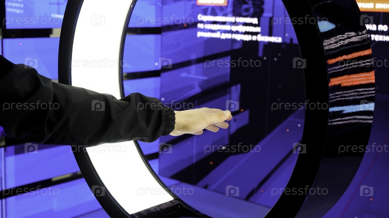 Испытания виртуальной реальности. СМИ. Огромная машина, показывающая различные иконки с компьютера, который реагирует на движения рук. Высококачественный 4k-фильм
