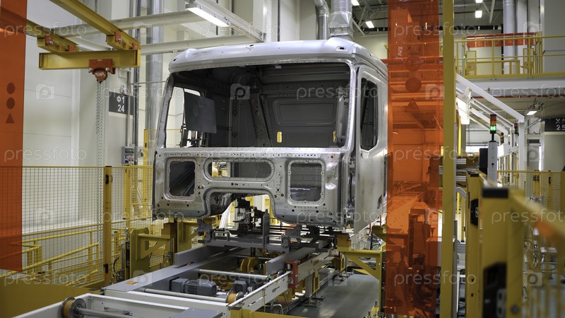 Корпус грузовика на заводе. Сцена. Рама грузовика движется вдоль рельсов завода. Современное оборудование на заводе для производства и сборки грузовиков