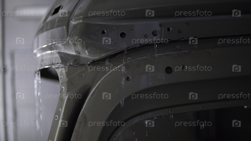 Гальванизация кузова на заводе. Сцена. Стадия производства рамы для автомобиля или грузовика на фабрике. Рама машины погружается в жидкость. Гальванизация металлического корпуса на заводе