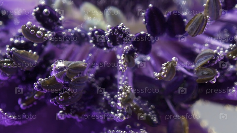 Закройте пузыри на поверхности водяных лепестков. Резервные кадры. Красивые пузыри на листьях и штаммах цветка. Яркий цветок с пузырями под чистой водой